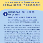 Am Dienstag, dem 18. November findet von 19- 21 Uhr nun die Podiumsdiskussion, nach der Verschiebung, zur sozial gerechten Wärmewende in der Hochschule Bremen (Neustadtswall 30, AB-Gebäude (Hochhaus), Staffelgeschoss 12) statt. Leider überschneidet sich unser offenes Plenum (18 – bis ca. 20 Uhr) mit der Podiumsdiskussion „Wärme für Alle“ (19-21 Uhr) und anderen Veranstaltungen. Die beiden…