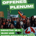 Du hast Lust, aktiv zu werden und den nächsten Klimastreik mitzuplanen?Dann gibt es keinen besseren Moment als jetzt! Schnapp dir gerne deine Freund*innen und komm am Dienstag, den 18.11., um 18:00 Uhr zum offenen Plenum in der Pappelstraße 35 (Greenpeace-Büro). Dort erklären wir euch, was wir genau machen, wie unsere Arbeit abläuft und wie ihr…